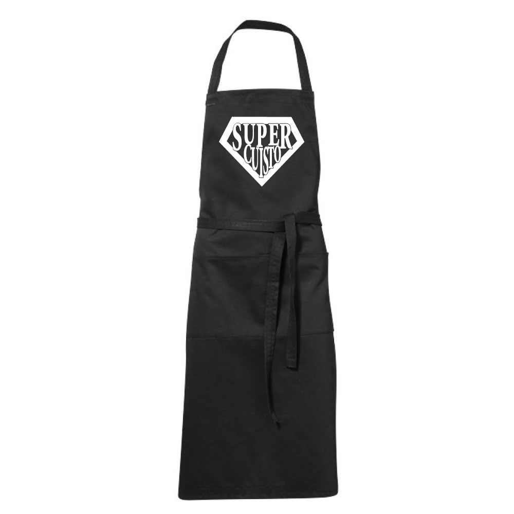 Tablier noir écrit super cuisto blanc dans le logo de superman en blanc.